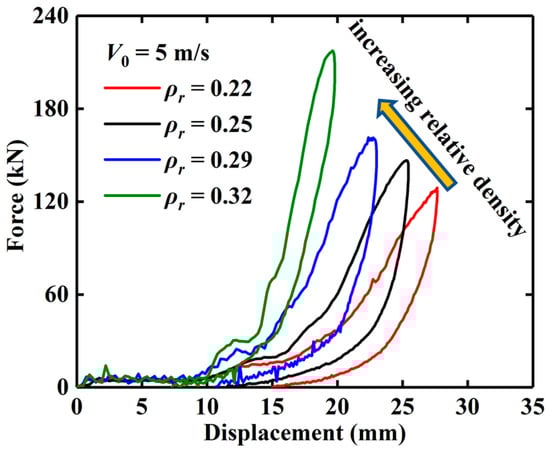 For each batch of EMWM, the test results of the EMWM specimens with the same relative density are similar. Therefore, only the force-displacement curve of one specimen of each batch was presented. Figure 5 shows the force–displacement hysteresis loops of the EMWM with different relative densities under different initial impact velocities. It is noted that the stiffness softening phenomenon is more obvious with the decrease in the relative density of EMWM. It can also be seen from Figure 5 that the maximum deformation of EMWM mainly depends on impact velocity and relative density. As impact velocity increases, the maximum deformation significantly increases.