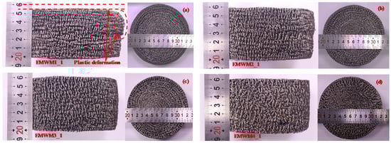 It is known from the forming process of EMWM that the EMWM is cold-formed under a specific external load. The forming process of EMWM is the plastic deformation process of metal wire helix. To fabricate a denser EMWM, a greater forming force must be applied. When the critical load is exceeded, the wire helix of the EMWM may be partially plastically deformed. Therefore, the EMWM with lower relative density is more prone to plastic deformation, as demonstrated in Figure 7. It can be seen that the extent of plastic deformation of EMWM decreases with the increase in relative density. The macroscopic plastic deformation of EMWM shows as follows: its molding direction height reduced, and non-molding direction expanded outward.
