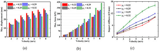 The mean values and standard deviation of the maximum displacement and maximum force under different impact velocities are presented in Figure 9a,b. Figure 9c shows the mean values and standard deviation of impact stiffness under different impact velocities. As shown in Figure 9c, the impact stiffness increases with the increase in impact velocity, and the impact stiffness is linearly related to the impact velocity. Meanwhile, the impact stiffness of the EMWM with the relative density of 0.22 at 8 m/s increases significantly. This is caused by the plastic deformation of the EMWM with a lower relative density. At 8 m/s, the increasing trend of the impact stiffness of EMWM with the relative density of 0.32 slows down obviously.