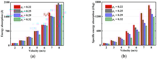 Based on the measured force–displacement curves, the energy absorbed (Ea) by EMWM in the tests can be calculated according to Equation (4). The mean values and standard deviation of the absorbed energy and the corresponding specific energy absorption (SEA) of EMWM under different impact velocities are presented in Figure 10. It can be seen from Figure 10a that the impact energy absorbed by the EMWM (ρr = 0.22, 0.25 and 0.29) is almost the same in the low-velocity impact tests (2, 3, 4, 5 and 6 m/s), while that absorbed by the EMWM (ρr = 0.32) is the least. In the low-velocity impact tests (7 m/s), the energy absorption of EMWM (ρr = 0.22) is significantly higher. However, in the low-velocity impact tests (8 m/s), the energy absorbed by the EMWM (ρr = 0.22) is significantly reduced. The reason for this is that the EMWM (ρr = 0.22) cannot maintain its original energy absorption ability after producing plastic deformation in the molding direction (6 and 7 m/s). Therefore, the EMWM may affect energy absorption after the plastic deformation. The red brace (Ep) in Figure 10a represents the dissipated energy by the plastic deformation of EMWM. It can also be seen from Figure 10b that the specific energy absorption significantly decreases with the increase in relative density.