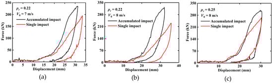 Experimental force–displacement curves of EMWM specimens after accumulated impact and single impact, (a) ρr = 0.22, V0 = 7 m/s, (b) ρr = 0.22, V0 = 8 m/s and (c) ρr = 0.25, V0 = 8 m/s.