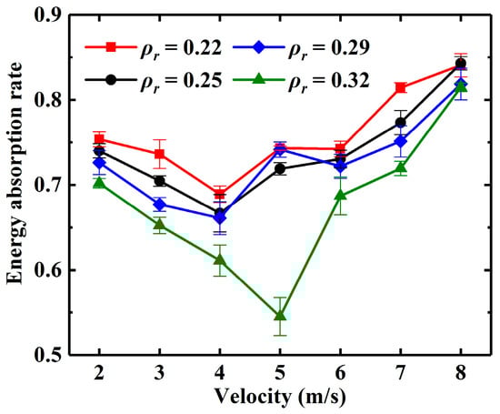 As the impact velocity increases, the energy absorption rate first decreases and then increases at a critical point, which is shown in Figure 12. The critical point is 4 m/s when the relative density of EMWM is 0.22, 0.25 and 0.29. The critical point is 5 m/s when the relative density is 0.32. This phenomenon is caused by insufficient friction and air damping and has been explained in the author’s previous research [9].
