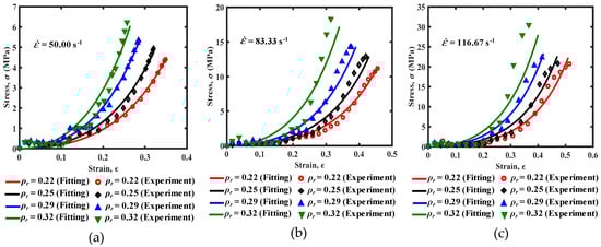 where D0 is an empirical fitting parameter. The value of D0 obtained by data fitting using the data of reference strain rate and reference relative density ( = 33.33 s−1, ρr0 = 0.22) is 13.95 MPa.