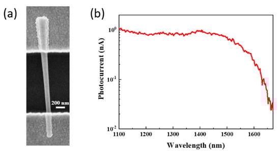 (a) Scanning electron microscopy (SEM) image of a single horizontal GaAs0.56Sb0.44 nanowire photodetector and (b) its room temperature photocurrent spectral response at a bias of 0.15 V. Reproduced with permission [9]. Copyright 2015, IOP Publishing Ltd.