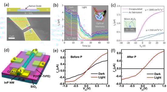 Single horizontal nanowires are usually fabricated on thermally oxidized Si substrates with electrodes on the two ends of the nanowire for drain and source contacts, as shown in Figure 2a. When a gate voltage is applied to the back of the heavily doped Si substrate, a field effect transistor (FET) structure is formed [37]. Alternatively, applying an insulating layer and a contacting layer on top of the nanowire, a top-gated FET can be achieved as shown in Figure 2d [11,35]. Such transistor structures have been used for InAs photodetectors to manipulate electron trapping sites formed by the native oxide, leading to tunable positive or negative photoconductivity [11,36,37,80,81]. Although most semiconductors have increased conductivity under photoexcitation (positive photoconductivity (PPC)), Alexander-Webber et al. reported an unusual negative photoconductivity (NPC) of InAs nanowire-based phototransistors under visible light illumination as shown in Figure 2b [36]. This surface photo-gating effect may be explained by the fact [36,80] that the free carriers in the InAs nanowire could be excited into charge trapping sites located in the surface native oxide after the absorption of light with photon energy much higher than the bandgap. It was also found that the time-dependent photoresponse of the device at increased gate voltages showed a more obvious and gradually saturated NPC behavior under illumination and increased current after the light was switched off with an optical memory effect [36]. Surface passivation of the transistors with a 90 nm layer of Al2O3 can be used to significantly reduce charge trap density with an order of magnitude increase in field-effect mobility (µ), leading to a PPC in InAs nanowires [36]. Zheng et al. demonstrated a top-gated InP nanowire photodetector in which the dark current was significantly suppressed by applying an ultrahigh electrostatic field to polarized P(VDF-TrFE) ferroelectric polymer as shown in Figure 2d–f [35]. This behavior could be maintained even when the gate voltage was removed. Very high photoconductive gain of 4.2 × 105, responsivity of 2.8 × 105 A/W, and specific detectivity of 9.1 × 1015 Jones at λ = 0.83 µm were measured [35]. More recently, Zhang et al. developed a P(VDF-TrFE)-coated InAs nanowire photodetector that exhibited an ultrasensitive photoresponse in a wide spectral range extending to MWIR [81,82]. The electrostatic field of the polarized ferroelectric material was capable of modifying the surface electron–hole distribution and the InAs nanowire band structure, resulting in a photoresponse at a MWIR wavelength of 4.3 µm (well below the InAs band gap) and a responsivity of 9.6 × 103 A/W and detectivity of ∼8.5 × 1010 Jones (cm·Hz1/2W−1) at 77 K [82].