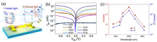 - Fang, H.; Hu, W.; Wang, P.; Guo, N.; Luo, W.; Zheng, D.; Gong, F.; Luo, M.; Tian, H.; Zhang, X.; et al. Visible Light-Assisted High-Performance Mid-Infrared Photodetectors Based on Single InAs Nanowire. Nano Lett. 2016, 16, 6416–6424. [Google Scholar] [CrossRef] [PubMed]