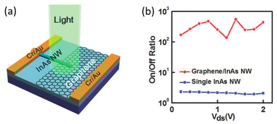 In addition to the aforementioned configurations, p-n or p-i-n nanowire photodiodes have been employed to operate under photovoltaic mode at zero bias [33] or photoconductive mode at reverse biases. Homojunctions can be formed either axially along the nanowire or radially conforming the nanowire core by a shell [33], whereas heterojunctions are normally formed by the core–shell configuration or a nanowire vertically grown on a substrate with different materials. Such junctions showed rectifying behavior to suppress the dark current and enhance the detector’s sensitivity, with relatively fast photoresponse [32]. Brenneis et al. demonstrated a Si/InAs heterojunction infrared photodetector formed by a single vertical unintentionally n-type InAs nanowire grown on a p-type Si substrate [43]. Miao et al. presented a graphene/InAs nanowire heterojunction photodetector with an Ilight/Idark ratio of 500 at λ = 1 µm by integrating a horizontal single InAs nanowire on a vertically stacked graphene layer as shown in Figure 4 [45]. Ma et al. reported a GaSb/GaInSb p-n heterojunction based photodetector [42]. High responsivity of 103 A/W, EQE of 104 and response time of 2 ms at the optical communication wavelength of 1.55 µm were obtained by applying a high forward bias (+1 V). Wang et al. demonstrated a GaAsSb/InAs p-n heterojunction-based photodetector that showed a wide spectral photoresponse ranging from 0.488 to 1.8 µm [90]. A responsivity of 0.0046 and 0.12 A/W to 1.31 µm telecommunication light was obtained under −0.3 and +0.3 V, respectively [90].