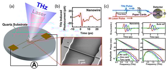 GaAs [94,95] and InP [63,96] nanowires have also been explored as photoconductive terahertz (THz) detectors, as a promising alternative to bulk semiconductor detectors due to its nanoscale spatial resolution and intrinsic polarization-resolved sensitivity. A single-nanowire photoconductive antenna (SNW-PCA) can be integrated into a pulsed THz time-domain spectroscopy (TDS) system with a Ti:sapphire laser to obtain the time-domain THz response (THz induced photocurrent) of a nanowire detector as shown in Figure 5a,b [94]. Kun et al. successfully demonstrated a narrow bandwidth single GaAs/AlGaAs/GaAs core–shell-cap nanowire photoconductive THz detector that operated well in the range of 0.1 to 0.6 THz due to local field enhancement by a simple two-pad antenna [94]. Further optimization of the antenna design yielded a single InP nanowire photoconductive detector with a high-amplitude and phase-sensitive time-domain spectrum in a broad bandwidth range of 0.1 to 2 THz [96]. The contact quality was improved using an n+-i-n+ structure implemented for the single InP nanowire THz detectors, leading to enhancement of signal-to-noise ratio, ~2.5 times of the undoped InP nanowire detector [63]. The function of the single nanowire THz detector has also been further confirmed by measuring the absorption coefficient and refractive index of paper cards in a THz-TDS system where a single InP nanowire detector was used to measure the transmitted THz signal through the paper card as shown in Figure 5c [96].