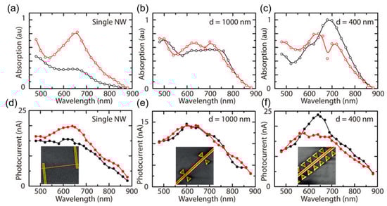 (a,b,c) Simulated absorption spectra and (d,e,f) measured photocurrent spectra of single nanowire and hybrid nanowire/nanoantenna structures for light perpendicular to the nanowire axis (black) and parallel to the nanowire axis (red), respectively. Reproduced with permission [48].