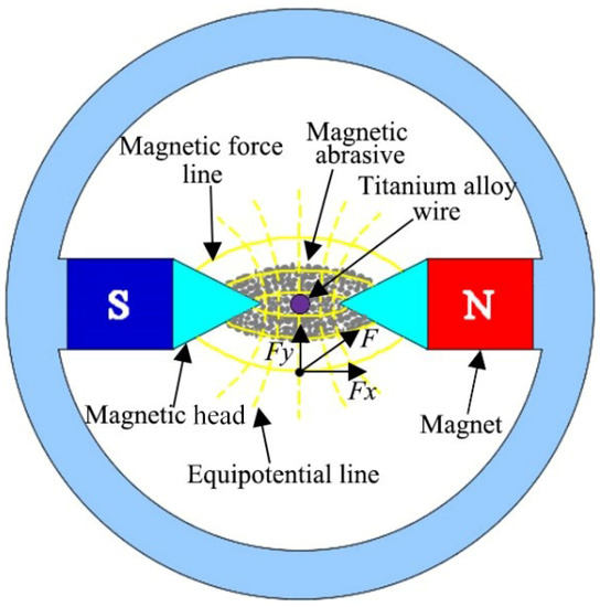When the titanium alloy wire is being processed, the sum force of the magnetic abrasive in the magnetic field is F, which is synthesized by two forces. One is Fx along the tangential direction of the magnetic force line; the other is Fy along the magnetic equipotential line direction.