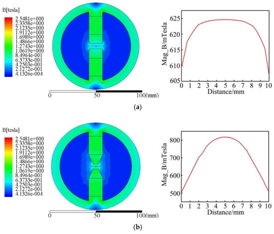 It can be known from the formula that the magnetic induction intensity is inversely proportional to the area perpendicular to the magnetic force lines. The magnetic head’s area perpendicular to the magnetic force lines can be changed by adjusting the taper of the magnetic head, thereby effectively increasing magnetic induction intensity of the processing area and changing magnetic field distribution. When the angle of the magnetic head is 0°, the magnetic head’s area perpendicular to magnetic force line is the largest; when the angle is 37°, the area is the smallest. The magnetic head of 25°, as one of the choices, was used to serve whether the changes of magnetic induction intensity and magnetic field distribution were the same as the theoretical expectation. Under a premise of constant distance between the magnetic heads, 37° is the max angle that the head can reach. The angle rise will change the distance between the magnetic heads, meaning that a single variable cannot be guaranteed.