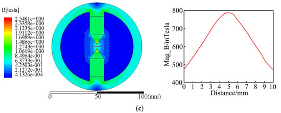 Simulation of the magnetic field intensity and the magnetic induction line: (a) 0° taper, distribution diagram; (b) 25° taper, distribution diagram; (c) 37° taper, distribution diagram.