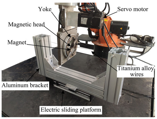 Figure 3 is a diagram of the experiment device. The main part of the device that produced the rotating magnetic field used in the experiment was composed of two groups of Nd–Fe–B poles (the pole size is 15 × 15 × 20 mm), two magnetic heads (the material is carbon steel; the size is 15 × 15 × 10 mm), yoke and servo control motor. Two groups of Nd–Fe–B magnetic poles fixed on the yoke produced the required magnetic field in the processing area. The magnetic field intensity and magnetic induction intensity gradient in the processing area can be changed by the magnetic head fixed on the magnetic pole. The processing performance and efficiency can be improved by the adjustment of the magnetic field intensity and the magnetic induction intensity gradient. The servo motor provided the power needed to rotate the magnetic field, and the speed range was 10–1500 rpm. The mobile device was composed of an electric sliding platform, a controller, two fixed supports and titanium alloy wires. The controller controlled the moving speed and range of the electric sliding platform. When being finished, the titanium alloy wire passed through the gap between the two magnetic heads in the pole-rotating device, and was fixed on the electric sliding table through two supports. The processed titanium alloy wire was wrapped between magnets by magnetic abrasive. The electric sliding platform used in the mobile device can make the titanium alloy wire reciprocate between the pole-rotating devices to prevent the forming of an annular groove on the surface of the wire when the same position is processed for a long time.