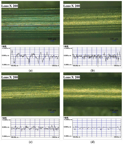 Figure 4 shows the microscopic image of the wire. Figure 4a is the original profile of the raw-wire material. From the microscopic image, a layer of black oxide skin on the original surface can be seen. Due to the manufacturing process of the wire itself, there were edges and bulges, and the surface finish was poor. After a period of practical use, there can be a certain degree of wear due to friction, which will affect the stability of the equipment to a certain extent. Figure 4b shows the surface microscopic image after the wire was processed with the 0° polymer head, indicating that the black oxide skin wrapped on the surface of the wire was removed to some extent. Figure 4c shows the surface microscopic image after the wire was processed with the 25° magnetization head, indicating that the black oxide skin wrapped on the surface of the wire was removed completely. Since the edge removal generated by processing and manufacturing was relatively complete, the surface finish was greatly improved. Figure 4d presents the surface microscopic image after the wire was processed with the magnetic head with a taper of 37°, indicating that the black oxide skin on the surface was completely removed.