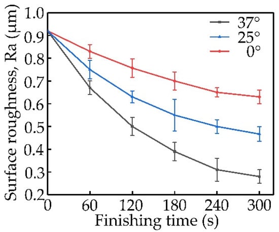 From Figure 5, the change process of the surface roughness of the wire material processed by the magnetic head with different tapers can be seen clearly. In the early stage of processing, the processing of the magnetic head with different tapers on the wire material was fast, and the change of the surface roughness was large, indicating that the surface roughness dropped fast. Afterward, surface roughness changed slowly, suggesting a low decrease rate of surface roughness. When the wire rod was processed by a magnetic head with a taper of 0°, the change of surface roughness was the lowest in the later stage, and the final value of surface roughness was the lowest among the three. After 300 s of processing, the Ra parameter of the surface roughness reached 0.63 μm. It was seen that when a magnetic head with a taper of 25° was used to process the wire, the change of the surface roughness increased, as well as the change of the surface roughness in the later stage of grinding at a slight rate. After 300 s of processing, the Ra parameter of the surface roughness reached 0.46 μm. When a magnetic head with a taper of 37° was used to process the wire, the surface roughness changed at the highest rate among the three, and finally after 300 s of processing, the Ra parameter of the surface roughness reached 0.28 μm. During the entire grinding-process time, the surface roughness changed quickly. It may be attributed to the difficulty in controlling the grinding pressure on the surface of the wire rod due to the smaller wire diameter. In summary, when the magnetic head with a larger taper was used, there was an obvious change in magnetic induction intensity near the processed wire rod, and the gradient of the magnetic induction intensity was larger. It improved the pressure of the magnetic abrasive on the wire rod surface and promoted the quality and efficiency of magnetic abrasive finishing.