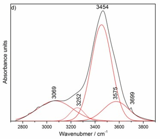 The progress of hydrotalcite formation in the nano-MgO–nano-Al2O3 blended paste observed by FT–IR method confirmed previous results from XRD. The most characteristic features of the FT–IR spectra of all blended pastes (Figure 2b) is the gradual disappearance of the sharp band at ca. 3701 cm−1 as a result of the consumption of the initially formed, free Mg(OH)2 and the appearance of the broad band in the range of ca. 3000–3700 cm−1, mainly due to O-H groups present in metal hydroxide layers (hydroxyl stretching region). The interaction between Mg(OH)2 and nano-Al2O3 particles was demonstrated by a reduction in the spectral intensities of the alumina along with the curing time. According to our research, the outline IR spectrum of nanoscale-alumina raw material (Figure 2a) was close to the gamma aluminum oxide (γ–Al2O3) nanoparticles presented in [33]. The wide and unresolved spectrum extending from ca. 450 to 850 cm−1 is typical for a complex and disordered crystallographic structure of nanoscale-alumina. After the initial curing period of 24 h, no band related to Al–OH is seen in the spectrum, indicating no alumina hydroxides were formed, as shown by the comparison of two spectra for blended paste at early hydration age (24 h, Figure 2b) and hydrated nano-Al2O3 powder (Figure 2a). Since, in a layered structure of brucite, Mg was partially substituted by Al along with the curing time, the electroneutrality was attained by incorporation of carbonate anions in the interlayer space (ca. 1371 cm−1), where water molecules (ca. 1643 cm−1) were also located (Figure 2b). Figure 2c,d presents a deconvoluted FT–IR spectrum of the nano-MgO–nano-Al2O3 blended paste at the age of 49 days in the range of 400–1100 cm−1 (c) and 2700–3800 cm−1 (d). Peak separations were carried out using Gaussian deconvolution. This approach was implemented since the kinetic energy distribution molecules (functional groups) is described by the Gaussian distribution. In other words, Doppler broadening produces a Gaussian line shape due to the Gaussian distribution of molecular velocities. Hence, this approach can be used successfully to study functional groups present in the complex cementitious systems. The positions of infrared bands of hydrotalcite as the main phase formed within this sample are summarized in Table 1. In the region below ca. 1000 cm−1 the IR spectrum of uncalcined Mg–Al–CO3-hydrotalcite shows the absorption bands at 550, 776 cm−1 and 605 cm−1, which correspond to the ‘Al’–OH and ‘Mg’–OH translation modes, respectively. Another absorption near 449cm−1 is associated with M–O stretching vibrations (M = Mg and Al) in the octahedral host layers, whereas the more complex spectrum of the incompletely unreacted cementitious matrix contains substrates or transitory hydrates [10,37]. Moreover, strong out-of-plane symmetric deformation mode (ν2) and antisymmetric deformation mode (ν4) of hydrotalcite ions around 776 and 684 cm−1, were observed, respectively. The band at 1362cm−1 indicated the antisymmetric stretching vibration (ν3) of carbonate anion [37,38,39,40]. The bending vibration of interlayer water molecules (dO–H) [20,41] occurs as sharp bands at 1628 cm−1 and it can be concluded that interlayer water molecules are hydrogen-bonded to interlayer ions [8,10]. The broad and strong band around 3400 cm−1 is associated with the OH–metal vibration. There were the stretching vibrations of hydroxyl –OH groups attached to Mg and to both Mg and Al in brucite-like layers (OH–Mg3: 3575 cm−1 and OH–Mg2Al: 3454 cm−1, respectively) [42,43,44]. The band that appears at 3700 cm−1 is associated with the O–H stretching vibration in brucite Mg(OH)2. Other bands in this region should be attributed to the –H2O bridging and H-bonded modes located at 3252 cm−1 and 3069 cm−1, respectively [8,10].
