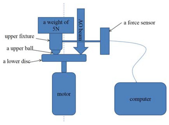 Their tribological performances were evaluated by a ball-on-desk tribo-tester under a vacuum environment (≤1.3 × 10−3 Pa). The schematic representation of tribo-tester is shown in Figure 2. The friction sensor model of the data acquisition system is C3S2U, which is produced by China Metrology Technology Development Corporation. The sensor precision is 0.005, and the acquisition rate is 5 data per minute. The counterpart was an AISI 440C steel ball of 8 mm in diameter. The conditions were as follows: three kinds of sliding rates, namely 20 r/min, 100 r/min, and 200 r/min; a normal load of 5 N; and a test duration of 60 min. The friction coefficient was recorded automatically by computer.