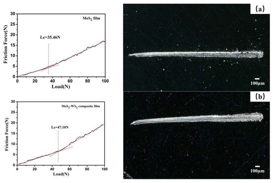 The film-base adhesion strength of the composite film on the stainless steel substrate was further studied by the scratch method. Figure 6 shows the scratch curves of MoS2–WS2 composite film and pure MoS2 film and the optical micrographs after the scratch tests. The adhesion strength (Lc) of the pure MoS2 film on the steel substrate was 35.46 N, and the adhesion strength (Lc) of the MoS2–WS2 composite film was 47.10 N, as shown in Figure 6b. Compared with pure MoS2 film, the composite film possessed stronger adhesion strength on the substrate. Shown in the scratch micrographs, the scratch edge of the MoS2–WS2 composite film was relatively smooth, and the film debris was fine-particle; especially, there was no large peeling phenomenon. Previous studies have proved that the doping and compound technology can improve the diffusion and chemical bonding of deposited particles on the film-based interface, thereby increase the film-based adhesion strength [26,27]. The addition of WS2 could promote interfacial bonding and make the composite film possess higher hardness. Based on the above tests, the composite film exhibited better toughness and bonding performance with stainless steel substrate.