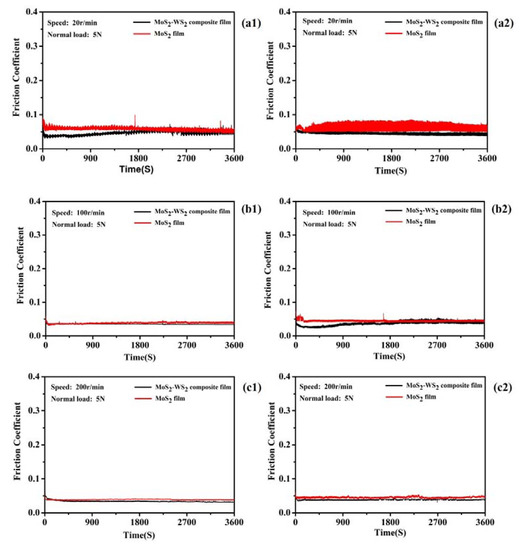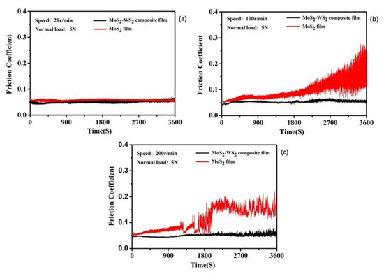 The real-time friction coefficient of pure MoS2 and MoS2–WS2 composite film at different sliding speed under AO-irradiation condition. (a) 20 r/min, 5N, (b) 100 r/min, 5N, (c) 200 r/min, 5N.
