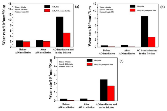 The wear rate of pure MoS2 and MoS2–WS2 composite film at different sliding cycles under different conditions: before AO-irradiation, after AO-irradiation, and with AO-irradiation. (a) 1.2 × 103 cycles, (b) 6.0 × 103 cycles, (c) 1.2 × 104 cycles.