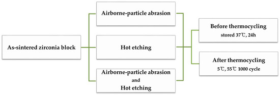- Okada, M.; Taketa, H.; Torii, Y.; Irie, M.; Matsumoto, T. Optimal sandblasting conditions for conventional-type yttria-stabilized tetragonal zirconia polycrystals. Dent. Mater. 2019, 35, 169–175. [Google Scholar] [CrossRef] [PubMed]