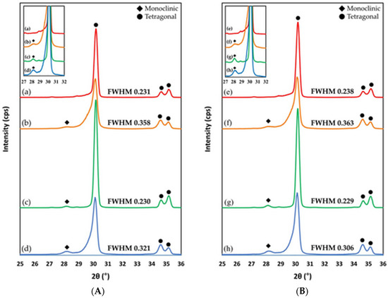 where and represent the integrated intensities of tetragonal (111)t peak and monoclinic (111)m and (−111)m peaks around 2θ = 30.2°, 31°, and 28.2°, respectively. The monoclinic phase content () was calculated using the equation reported by Taraya et al. [37], as follows: