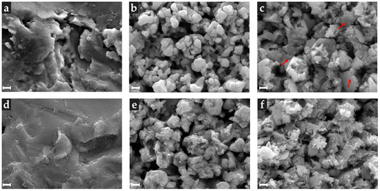 Scanning electron microscopy photomicrographs of zirconia ceramic disc after different surface treatments: zirconia stored in distilled water at 37 °C for 24 h ((a), (b), and (c)) and thermocyced zirconia (1000 cycles between 5 °C and 55 °C ((d), (e) and (f))); (a,d) airborne-particle abrasion (group A); (b,e) hydrofluoric acid (HF) etching (heated up to 100 °C, 10 min) (group E); (c,f) HF acid etching after airborne-particle abrasion (heated up to 100 °C, 10 min) (group AE). (Scale: 100 nm; Magnification: 40 k).