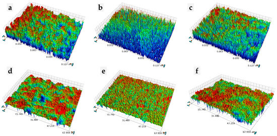 Roughness (Ra) images of a zirconia ceramic disc after different surface treatments: zirconia stored in distilled water at 37 °C for 24 h ((a), (b), and (c)) and those of thermocycled zirconia (1000 cycles between 5 °C and 55 °C ((d), (e), and (f))); (a,d) airborne-particle abrasion (group A); (b,e) HF acid etching (heated up to 100 °C, 10 min) (group E); (c,f) HF acid etching after airborne-particle abrasion (heated up to 100 °C, 10 min) (group AE).