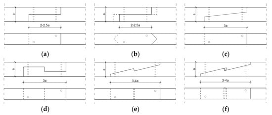 Stop-splayed scarf joints (presented inter alia in [,,,,] and referred to as ‘Bolt of lightning’, ‘Trait-de-Jupiter’) were widely used in historical buildings. They constituted a sophisticated type of connection along the length of elements in the form of a scarf joint. In historical structures, there are also elements connected along their whole length with a so-called stop-splayed scarf joint or a composite beam (built-up beams, composite beams with a teethed joint), described inter alia in [,,].
