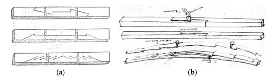 Stop-splayed scarf joints (‘Bolt of lightning’) were used in ancient times, for example, in the Roman construction of bridges, and later, in roof beam constructions and wooden ceiling construction elements right up to the end of the 19th century. A special period of development for this method of joining beam elements was that of the Italian Renaissance, which was the time of such masters as Leon Battista Alberti (Figure 2a) [] and Leonardo da Vinci (Figure 2b) []. This method of connecting elements along their length was applied especially in elements subjected to tensile and bending forces. Typically, the joints were wedged, which was supposed to help in transferring loading and to ensure a tight fitting joint. Today, they are used mainly to strengthen and repair historical structures. Examples of stop-splayed scarf joints (‘Bolt of lightning’) and so-called composite beams are presented below (Figure 2, Figure 3 and Figure 4).