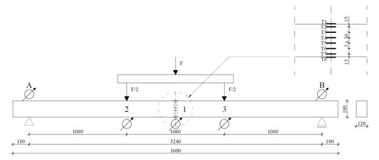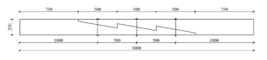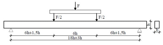 In order to determine the load-bearing and the load-deflection plot, the beam was subjected to four-point bending tests, in accordance with the standard procedure described in []. A schematic of the experimental testing is provided in Figure 12 (drawing based on data from []).