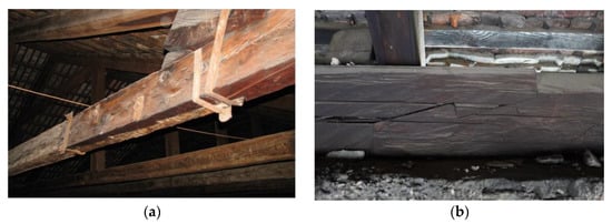 Examples of scarf and splice joining of wooden beams in existing buildings: (a) building in Italy, (b) building in Poland—13th century Czocha Castle in Sucha.