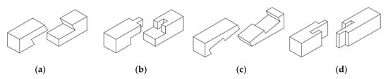 Wood has been used for centuries in different buildings and structures, from residential buildings, through sacral architecture, to defensive structures for settlements and towns or complex engineered structures []. A large number of these structures, which have survived tens or hundreds of years, now require interventions to maintain or improve their technical condition. A key factor in their development is related to joints, which enabled building elements to be connected into a single whole and for loading to be shared between elements. Historical joints pay testimony to the highly developed techniques and craftsmanship of builders at that time []. It should also be noted that, to date, there are few reliable references that include detailed specifications related to forming carpentry joints [], as their creators relied mainly on their own experience and tradition.