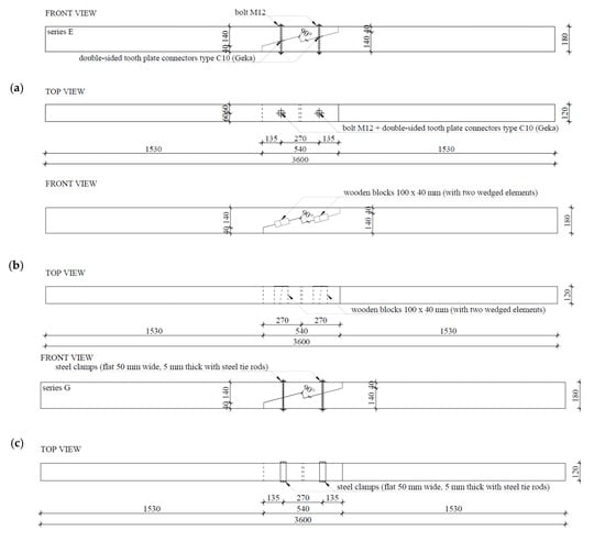Schemes of the experimental testing models: (a) series E—with 2 drawbolts (double-sided tooth plate connectors type C10 + M10 screws), (b) series F—with wood inserts (and additional steel clamps), (c) series G—with steel clamps.