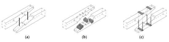Axiometric schematics of joints used in the experimental models: (a) series E—with 2 drawbolts (double-sided tooth plate connectors type C10 + M10 screws), (b) series F—with wood inserts (and additional steel clamps), (c) series G—with steel clamps.
