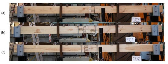 View of an example beam in each series: (a) series E—with 2 drawbolts (double-sided tooth plate connectors type C10 + M10 screws), (b) series F—with wood inserts (and additional steel clamps), (c) series G—with steel clamps.