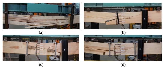 All the beam models (altogether 12 elements) were loaded at a constant speed right up to their failure. The failure of beams in series A resulted from the shearing of fibres in the bottom part of the central area of the beam where earlier there were no visible cracks (except for cracks in the vicinity of knots in the beams). Sudden failure with no prior signs occurred. Generally, the failure of beams in series E, F, and G involved a loosening of the joint in the lower zone of the central part of the beam and the appearance of cracks and fractures on the edges of the joint and in points weakened as a result of earlier flaws (such as knots or primary cracks of the beam). The tested joint was unsymmetrical. In the right part of the joint, the beam elements were bent and pressed to each other. In the left part of the joint, the elements were also bent, but the bottom element was not pressed and the joint was loosened. Destruction occurred in the left part of the joint by breaking the upper element (visible cracks above the edge of the joint). The cross-section of the destruction was in the joint area. Failure resulted from delamination due to stretching across the fibres. The failure views of selected experimental models are presented in Figure 15.