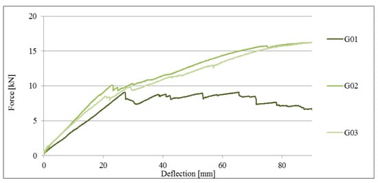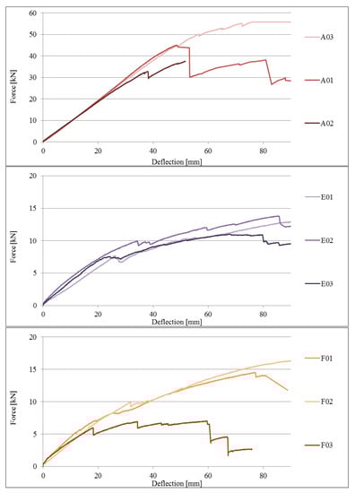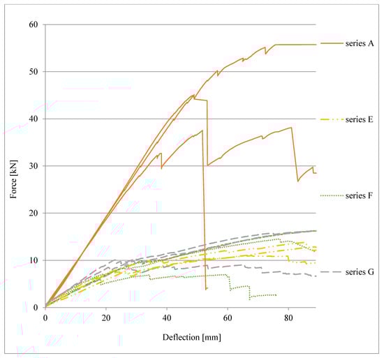 As part of the comparative analysis, in Figure 19, a comparison of the load-deflection plots of the beams of series E, F, and G to the reference beams of series A is presented. It should be noted that the tested beam series attained similar values for final deflection, but with different levels of force, which are several times higher for series A, whereas the values for beams of series E, F, and G were similar to one another.