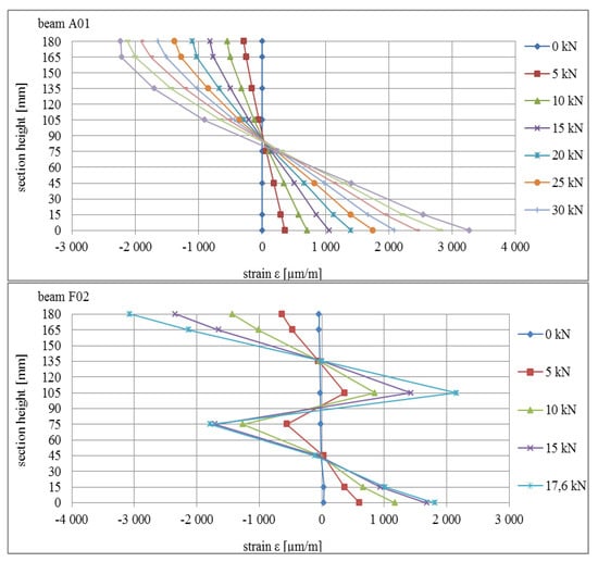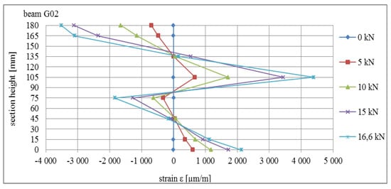 Deformations in the area of point 1 in the central part of the beams are presented in Figure 17. The deformation profiles are consistent with expected curves: for beam A01, the standard image of deformation in the cross-section for the continuous beam was obtained, whereas for beams E02, F02, and G02, it was noted that the typical curve shape for the composite cross-section was as presented inter alia in [].