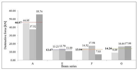 Table 1 presents the value of the ultimate forces Fu obtained for each of the beam series. Ratio of mean destruction force for specified series to reference beam series is FuX/FuA, where X stands for E, F, or G (and expresses mean destructive force for this series).