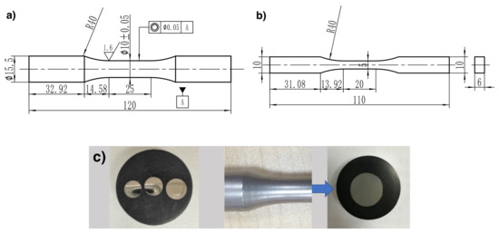 Specimen geometries tested in the present work. (a) The round specimens for instrumented indentation tests of the shot peening treatment. (b) The brick specimens for monotonic tensile tests of the pre-deformed treatment. (c) The samples for instrumented indentation tests of the pre-deformed and shot peening treatments.