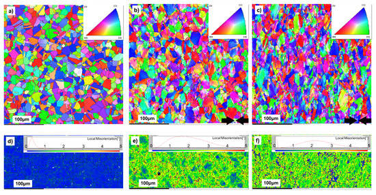 The microstructures of different treated IN718 samples were analyzed by EBSD: IPF maps (a–c) and KAM maps (d–f) of Base material (a,d), pre-deformation for 11.7% (b,e) and pre-deformation for 30.9% (c,f).