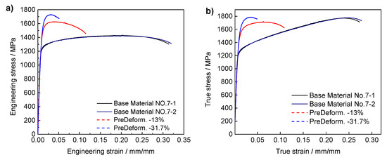 The static material properties of the IN718 base material and pre-deformed specimens in Table 2 are summarized in Figure 3a. In Figure 3b, the true stress is plotted as a function of the true strain, which was calculated from the results measured by extensometer.