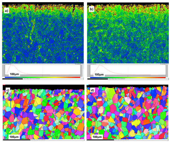 The microstructures of different shot-peened IN718 samples were analyzed by EBSD: (a) KAM map of 0.1 mmA, (b) KAM map of 0.2 mmA, (c) IPF map of 0.1 mmA and (d) IPF map of 0.2 mmA. The KAM maps illustrate the distribution of local misorientation in the material and the IPF maps illustrate the grain shape and size.