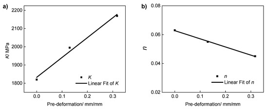 Variation in the mechanical properties with the deformation of pre-deformed IN718. (a) The fitted relationship between K and the pre-deformation. (b) The fitted relationship between n and the pre-deformation.
