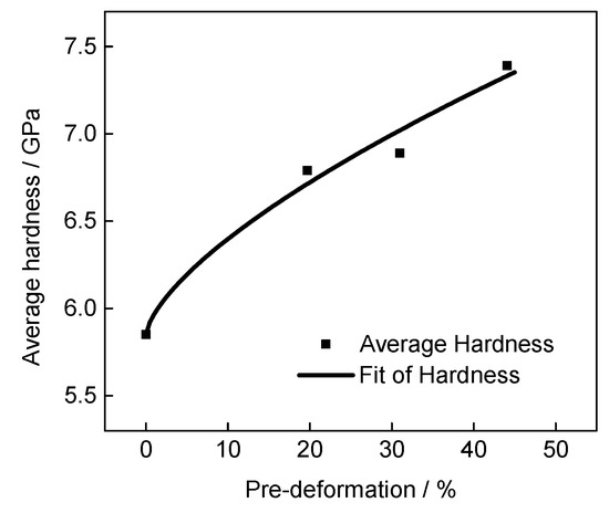Hardness is a characterization of the comprehensive mechanical properties of materials. The mechanical properties of materials, including the plastic deformation and strain hardening ability, can be characterized by measuring the hardness [37,38]. Therefore, an empirical functional relationship between the hardness and plastic strain can be established for a specific material based on the test data. Furthermore, noted that the tendency of hardness increasing is approach to the power law, as shown in Figure 7. Based on this observation, the relationship between hardness and pre-deformation could be expressed with the following equation: