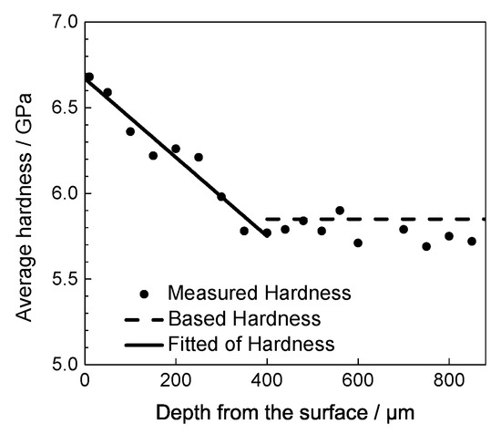 The material of the modified layer was tested with instrumented indentation according the diametrical direction. The hardness distribution test results are shown in Figure 8, where the round solid dots represent the experimental data. The horizontal axis represents the distance between the indentation position and the surface, which is the distribution along the depth. The results show that the hardness decreased with increasing depth, and the hardness trended to a stable value, i.e., the hardness property of the base material. The hardness decreased until a depth of 400 μm was reached, corresponding to the depth of the modified layer. According to the results, the hardness distribution is assumed to be a linear distribution, and the fitting result is shown by the solid line in the figure. The hardness of the base material was processed with averaging. The average result was 5.77 GPa, shown with dashed line. The linear distribution fitted relationship between the hardness and depth as follows: