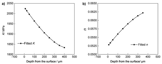 Parameters K and n changing with depth for 0.1 mmA shot-peened IN718 specimens. (a) The fitted distribution of K with depth. (b) The fitted distribution of n with depth.