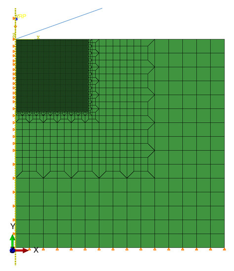The boundary of the FEM simulation model for instrumented indentation tests was simplified without affecting the discussion of the computation results. A simplified two-dimensional axisymmetric model [39] was used in this simulation. For the limit of the two-dimensional axisymmetric model and the tetrahedral structure of the Berkovich indenter, an equivalent conical indenter with the same contact area function was created. The equivalent cone angle of the cone was 140.6. The indenter in the model was simplified as a rigid diagonal line with an angle of 70.3 from the center axis. The simulation was set to neglect the friction between the indenter and the specimens. The two-dimensional model was set at 30 × 30 μm. The mesh of the indenter contact area of the indenter was refined, and the grid was gradually thickened away from the indentation area to improve the computation efficiency, shown in Figure 12.