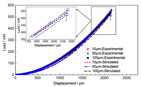 That is, the instrumented indentation loading test process was simulated with FEM. Three points located at different distance from surface of shot peening specimens, 10, 50 and 100 μm, were calculated. The load-displacement relationship of different points at different depth was obtained, and the results are shown in Figure 13. The solid points of different shapes in the figure represent the load-displacement test data at different depths of the test position on the surface of the test piece, and the corresponding dash or dash dot lines indicate the result of the FEM simulation results.